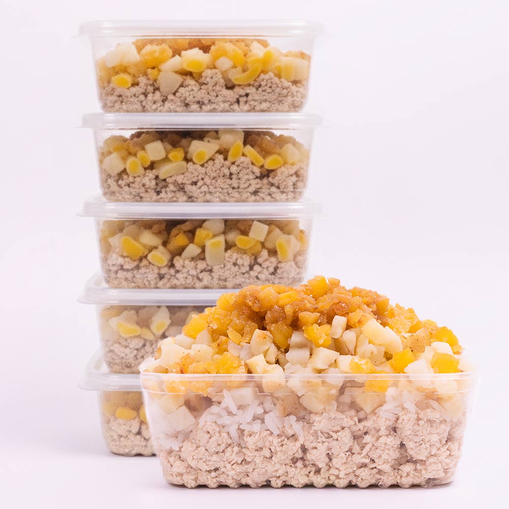 🦃 Peru: coxa de peru, arroz branco, batata inglesa, mandioquinha e óleo de coco.